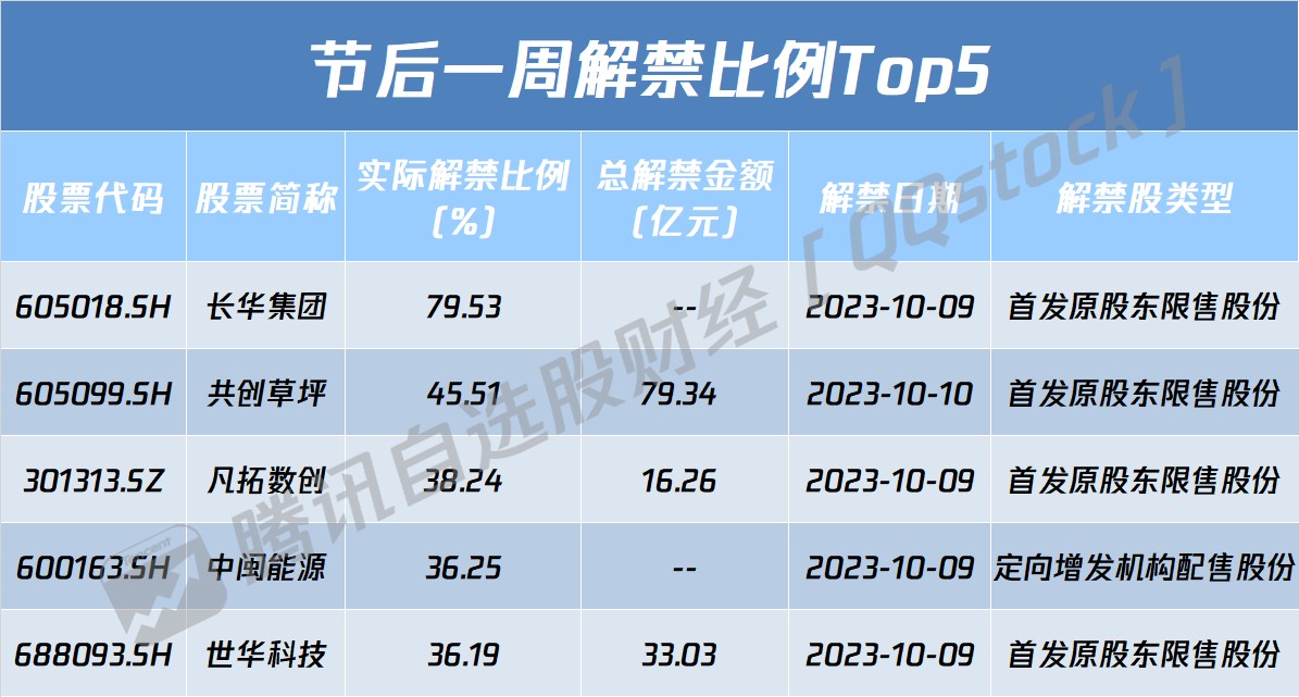 从解禁比例来看,节后一周长华集团解禁比例达79.53%,其次解禁比例居前的分别为共创草坪、凡拓数创。