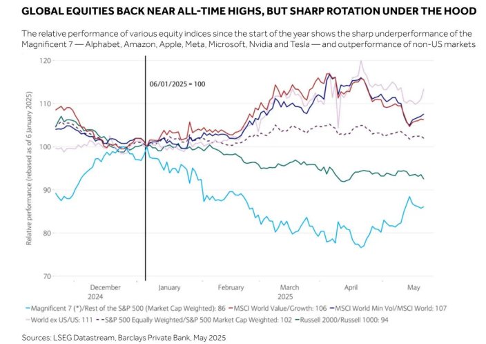 在今年的头条行情之下,市场出现了显著的轮动(参见下图)。资金已从年内最拥挤的交易(尤其是美国大型科技股和以美国为中心的资产)流出,转向更广泛的市场板块和国际市场。
