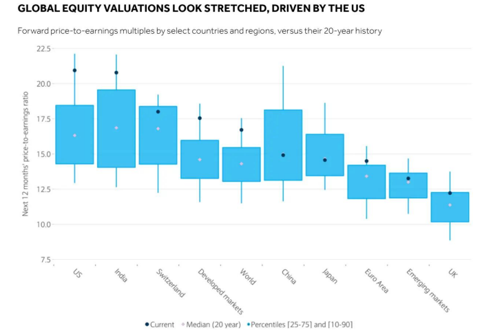 在近期反弹之后,股票估值仍处于高位,尤其是美国股市(参见下图)。当前的估值倍数与对增长放缓、通胀风险上升以及持续的政治不确定性的预期不相符。