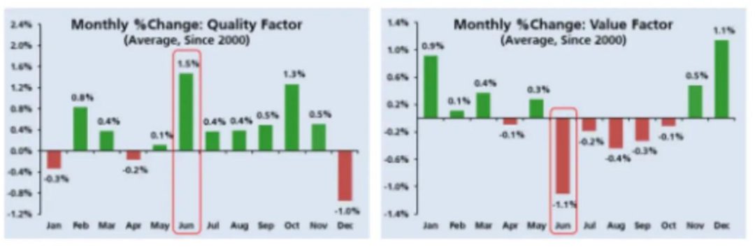 再创历史新高可能要等到七月 —— 七月具有较强的季节性,这一预测与瑞银一直强调的总统周期就职年的情况一致。这听起来可能是一个乏味的预测,但现在去海滩度假还为时过早。六月可能看似平淡无奇,但表面下剧烈的因子轮换表明仍有许多事情可做。二、剧烈的因子轮换创造机会回顾过去 25 年,六月是因子轮换最剧烈的月份。它是质量因子、动量因子和规模因子(大盘股相对小盘股表现较好)表现最佳的月份,也是价值因子表现最差的月份(图表 3-4)。