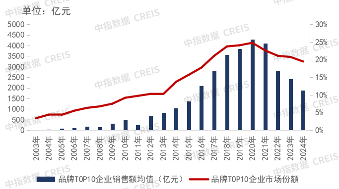 2024年,TOP10企业销售额较2003年增长71倍,企业市场份额由2003年的3.4%增长至19.5%。但受行业下行压力影响,TOP10企业销售额及市场占有率已连续四年下降。