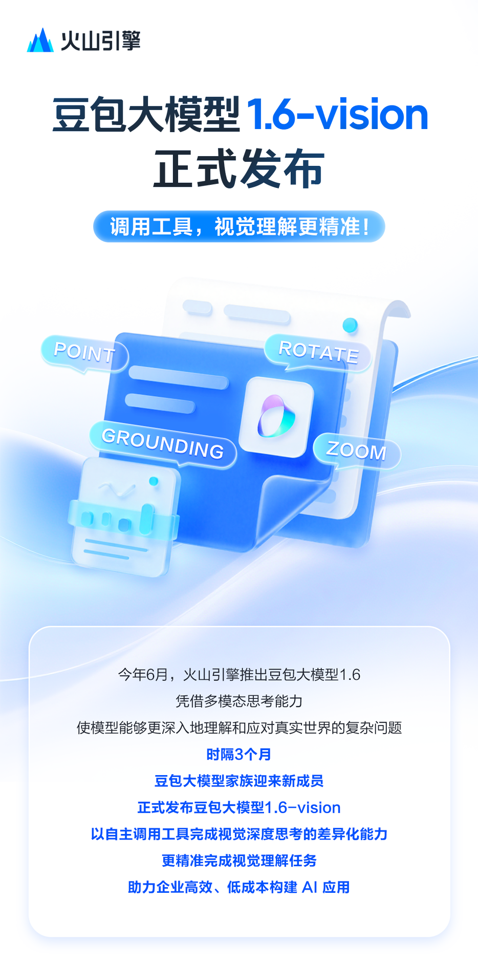 智通财经APP获悉,火山引擎官微9月30日宣布,正式发布豆包大模型1.6-vision。据介绍,豆包大模型1.6-vision是豆包大模型家族首个具备工具调用能力的视觉深度思考模型,拥有更强的通用多模态理解和推理能力,并支持 Responses AP,以更高性价比更好满足客户在视觉理解精准度上的高阶需求。