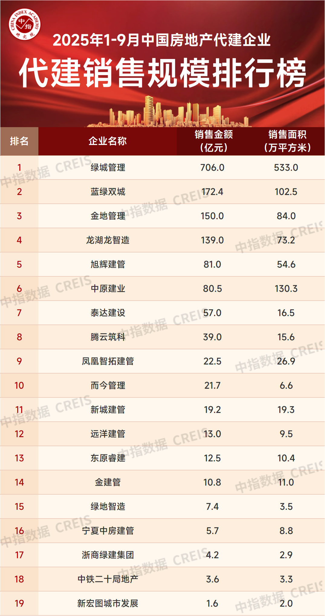 智通财经APP获悉,近日,中指研究院发布《2025年1-9月中国房地产代建企业排行榜》。数据显示,2025年1-9月,绿城管理(09979)以706亿元合约销售金额位列代建销售榜首位。蓝绿双城和金地管理代建项目销售金额分别为172.4亿元和150.0亿元,位列二、三位。随着入局代建企业增加,代建项目纷纷进入销售阶段,代建企业销售规模也在持续提升。当前,大部分商品住宅均需要代建企业代销,因此,销售去化能力也成为代建企业项目拓展的重要能力,日益受到代建企业重视。