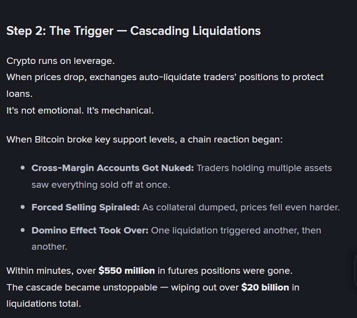 帖子描述了爆仓连锁反应的具体细节:首当其冲的是,采用交叉保证金的账户因部分资产价格下跌而被整体强制平仓,其抵押品(collateral)被系统强制卖出;接着,强制抛售的抵押品进一步打压价格,形成了“一次清算触发另一次清算”的瀑布效应。数据显示,在短短几分钟内,就有超过5.5亿美元的期货头寸消失,最终导致了总额超200亿美元的清算惨案。
