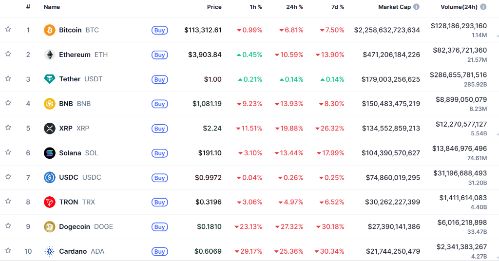 比特币价格周五从逾12.6万美元历史高点大幅回落,一度失守11万美元关口,当天跌幅达13.5%。以太币一度暴跌逾17%,瑞波币和狗狗币则更是暴跌逾30%。