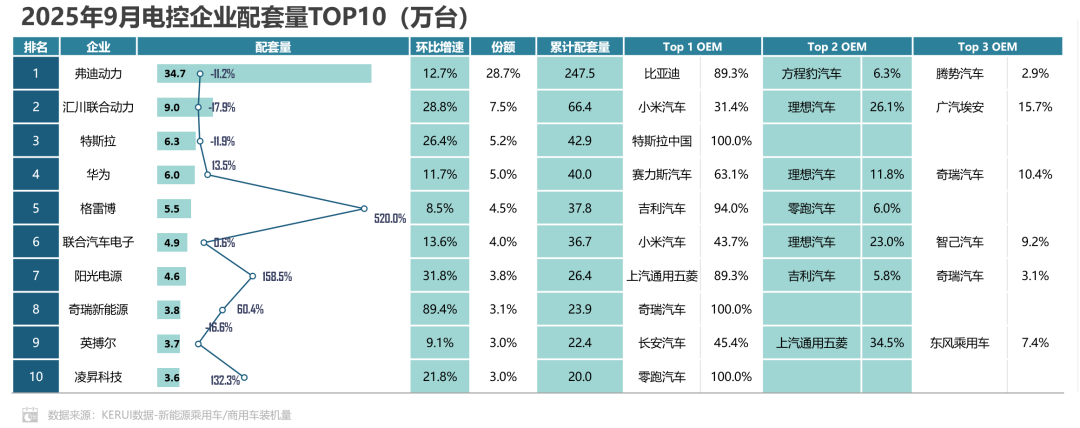 2025年9月,前十企业份额合计占比达到62.7%,9月配套量环比上升。前十企业中,所有企业的配套量环比都实现上升。赛克科技凭借五菱的高销量,实现快速增长。格雷博依托吉利实现高增速。