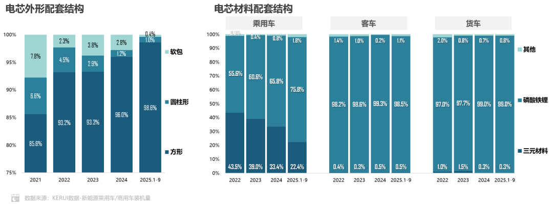 电芯外形方面,1-9月方形电芯配套占比为98.6%,圆柱形电芯配套占比1.0%,软包电芯配套占比0.4%。