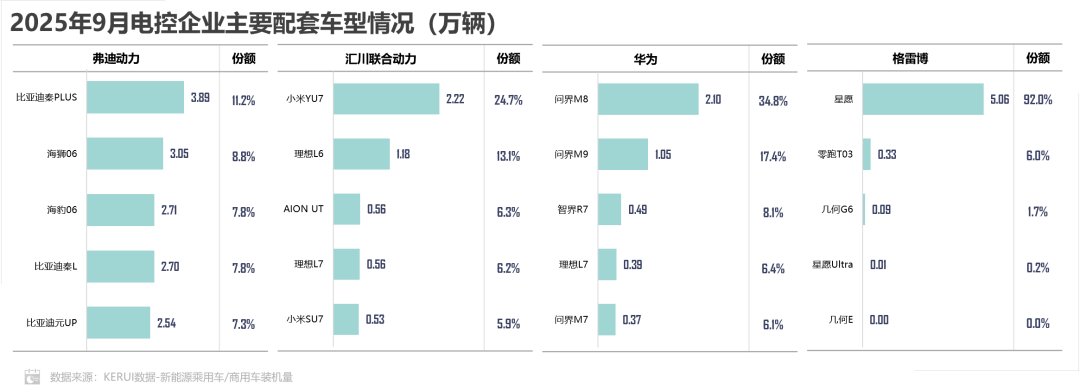 2025年9月,弗迪动力前五车型占比达到41.8%。比亚迪秦PLUS占比达到10.9%,前五车型单车售价均较低,走量车型保证了弗迪动力每月的配套量。汇川联合动力配套车型中小米YU7占比最高,达到23.3%。赛克科技主要配备五菱品牌,其中五菱宏光MINI单车型占比达到59.7%,华为主要配套车型为问界系列,其中M8车型份额达到33.1%。
