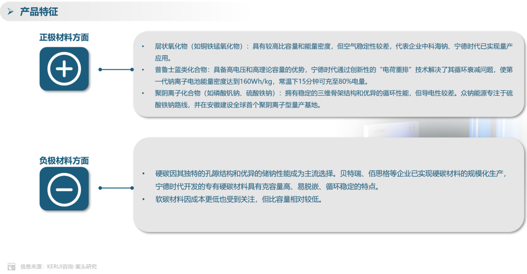 目前,钠离子电池技术得到快速发展,其主要产品特征和发展方向集中在正极材料和负极材料两方面。