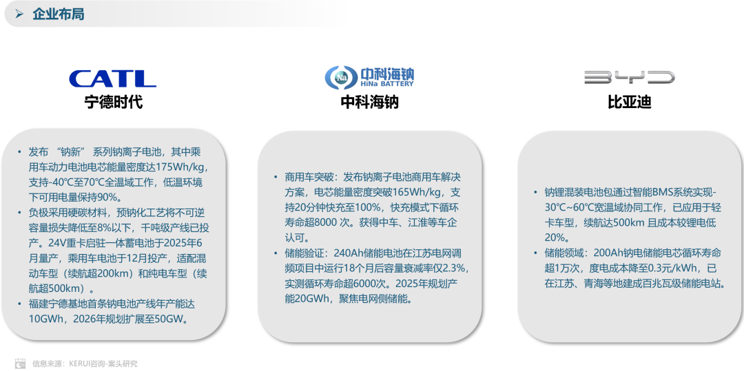 现阶段,已经有多家企业布局钠离子电池产品,宁德时代、中科海钠和比亚迪都在加速研发钠离子电池产品。