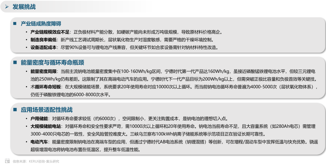 现阶段,钠离子电池的发展还存在着产业链成熟度障碍、能量密度与循环寿命瓶颈和应用场景适配性挑战。