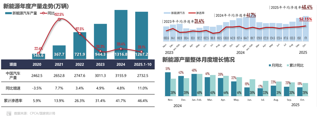 2025年1-10月,中国新能源汽车产量1267.2万辆,同比增长28.1%,累计渗透率达到46.4%。中国新能源汽车市场延续高速增长态势,成为汽车产业发展核心动力,政策支持、产品创新和出口增长共同推动市场向高质量方向发展。