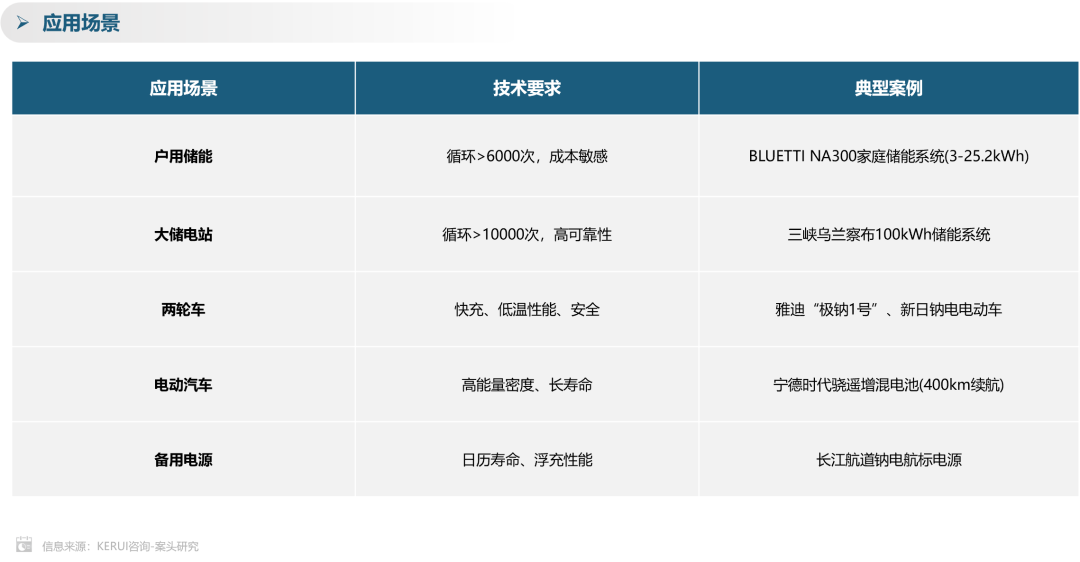 应用场景上,钠离子电池可应用在户用储能、大储电站、两轮车、电动汽车和备用电源等领域。