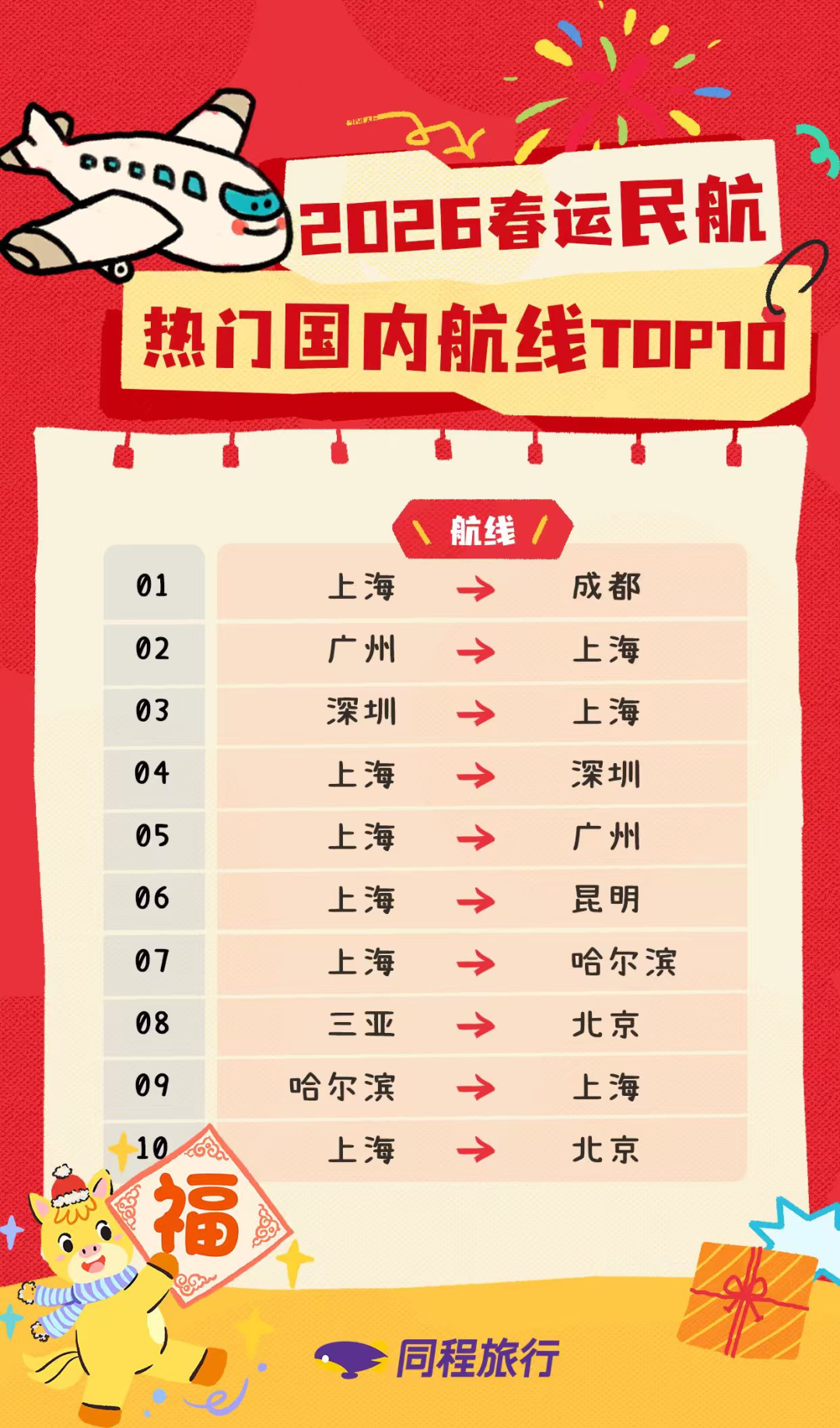 智通财经APP获悉,1月20日,同程旅行发布了《2026年度春运旅行趋势报告》。《报告》显示,民航、铁路节前的第一波出行高峰预计将出现在2月6日前后,节前的客流峰值预计将出现在2月13日和14日两天。春运期间,国内航班的机票价格较去年同期略有上涨。热门线路方面,春节前铁路热门出发城市主要集中于广州、重庆、北京等一线城市及区域中心城市,民航的热门出发城市则集中于上海、广州、深圳等一线城市。“史上最长春节假期”显著拉动了今年春运期间的多次出行需求,其中,民航2次以上出行旅客占比预计将达13%,铁路2次以上出行旅客占比则有望突破30%,均为2023年以来的同期新高。