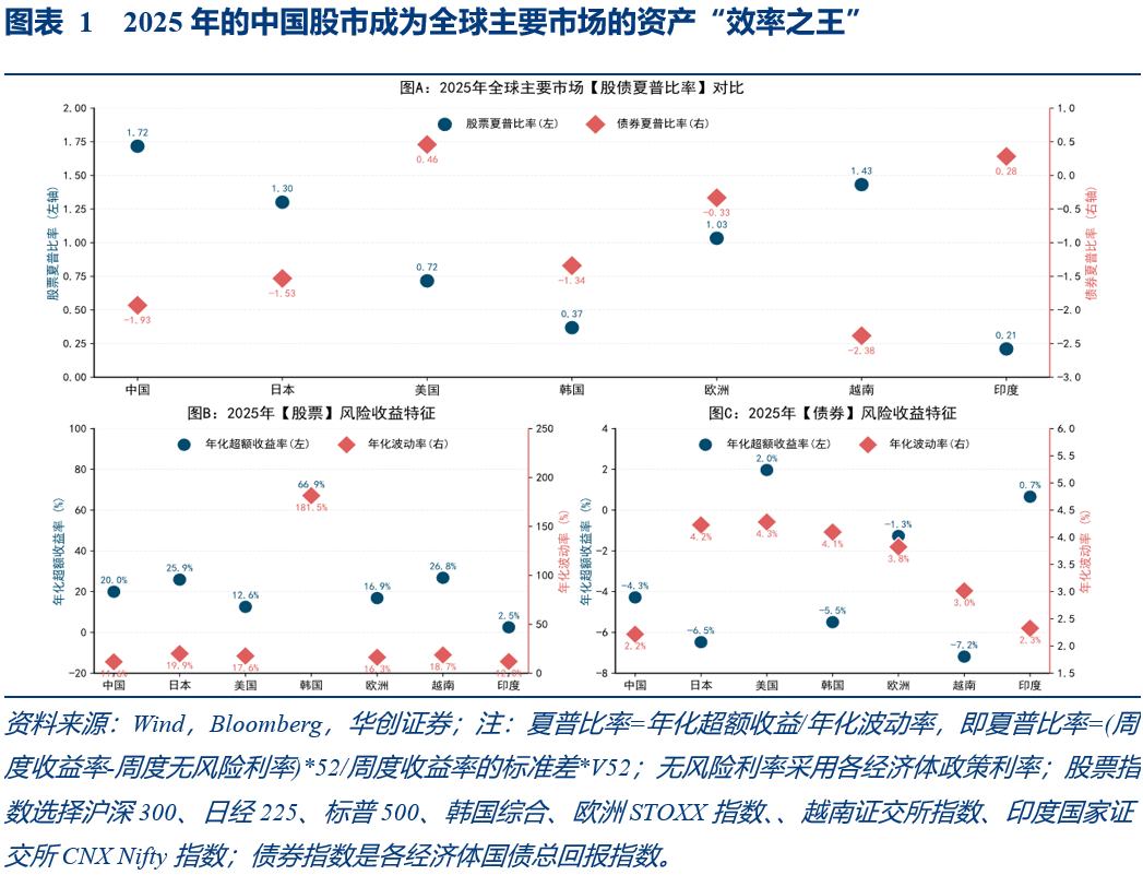 综合来看,2025年中国股票市场不仅摆脱了低迷,更在风险调整后收益(夏普比率)上领跑全球主要经济体,其表现可概括为“高效率、低波动”。在股市夏普比率领跑的同时,中国债券市场的夏普比率跌至-1.93,年化收益率为-4.3%。这种股债表现的剧烈分化,或意味着资金正从传统的避险债券端大量流向更具投资效率的权益端。