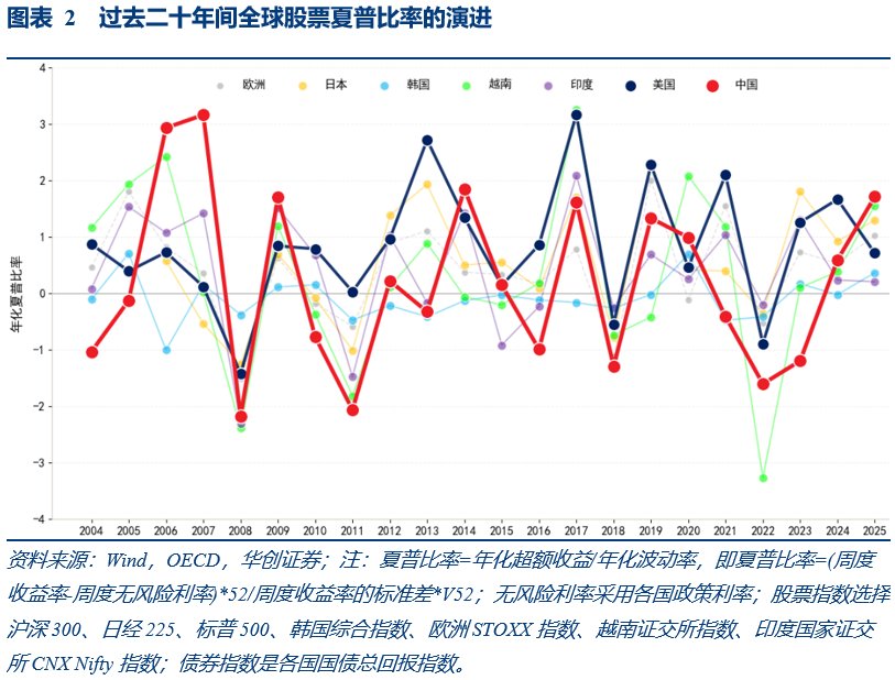 通过回溯2000年以来中国、美国、日本、韩国、欧洲、越南和印度市场的股票夏普比率走势,我们发现: