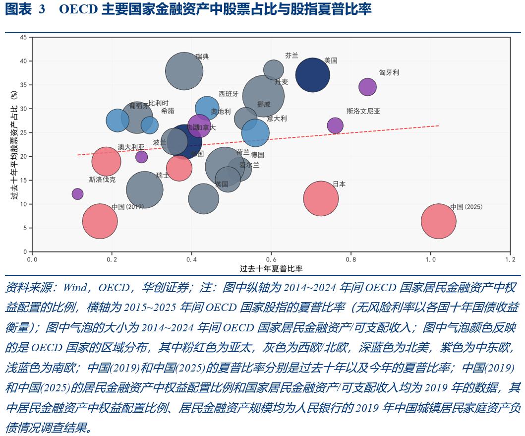OECD国家来看,过去十年,美国夏普比率均值在0.70,居民金融资产中股票资产占比平均在37.07%,属于典型的高夏普,高权益配置。澳大利亚,夏普比率均值在0.19,居民金融资产中股票资产占比平均在18.94%,属于典型的低夏普,低权益配置。以夏普比为自变量,股票资产占比为因变量,回归显示,0.1个单位的夏普比的变化,带来股票占比提升1.56个百分点。