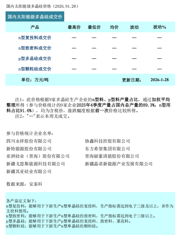 展望后市:春节临近叠加一季度传统淡季,国内终端需求与海外组件订单均缺乏强劲支撑,同时银浆等辅材高价也导致电池片成本压力难减。供应端方面,头部企业主动执行停产、减产计划,推动供应收缩,对价格形成一定支撑。但是,行业高位库存仍未有效消化,对价格上行的压制作用依旧持续。综合来看,在供应收缩、需求疲软、高位库存等因素相互制衡的格局下,预计短期内多晶硅价格将维持窄幅平稳运行态势。