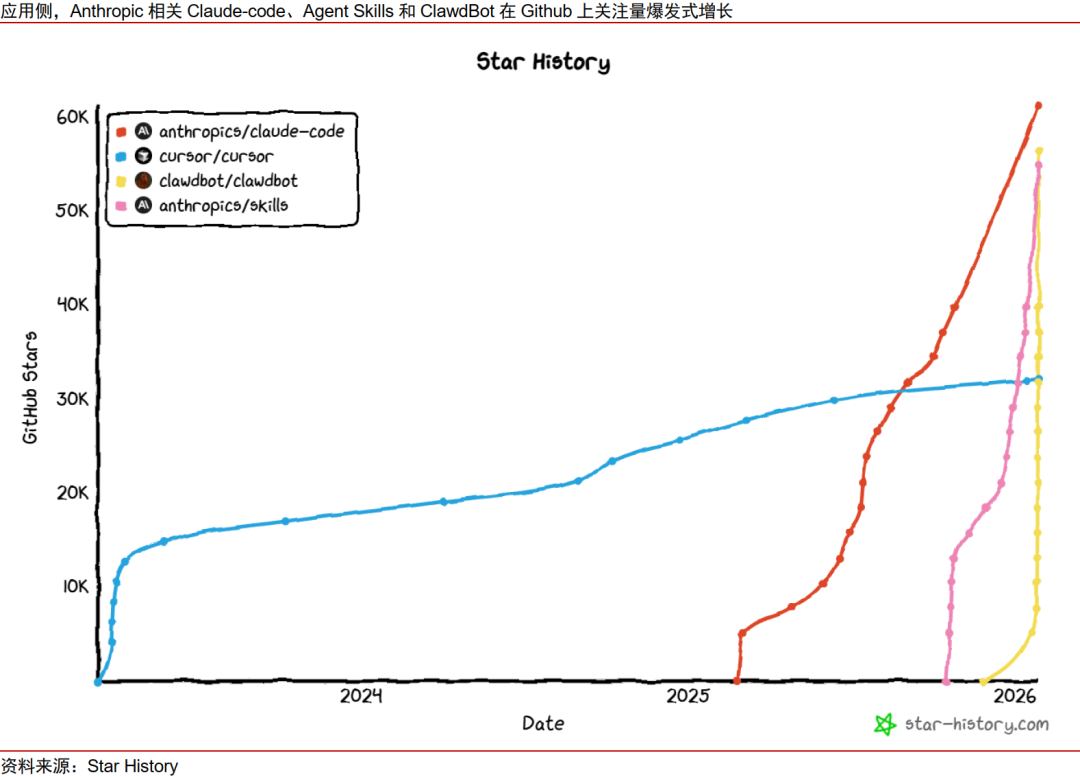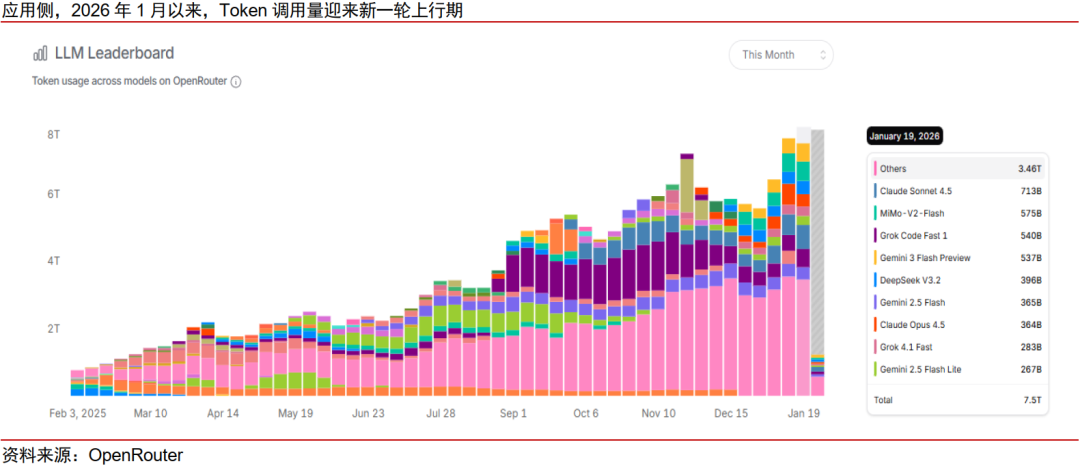 近期,AI智能体应用MoltBot(原ClawdBot)迅速出圈,AI Agent继续向前迈进一步,能够获得电脑操作的更高权限,并能够处理更复杂场景的任务,同时也带来更多算力消耗。而Anthropic发布的Claude Code、Agent Skills、Claude Cowork、Claude in Excel等一些列产品亦扩展了Agent落地的使用场景。从实际使用数据来看,根据OpenRouter,自2026年1月初起, Token调用量已连续2–3周保持高速增长,AI应用使用量持续攀升。根据The Information,Anthropic上调2026和2027年营收预期分别至180亿美元和550亿美元。类比上一轮Gemini带来谷歌云的繁荣,Anthropic的云服务供应商亦有望迎来推理需求的迅速上行。