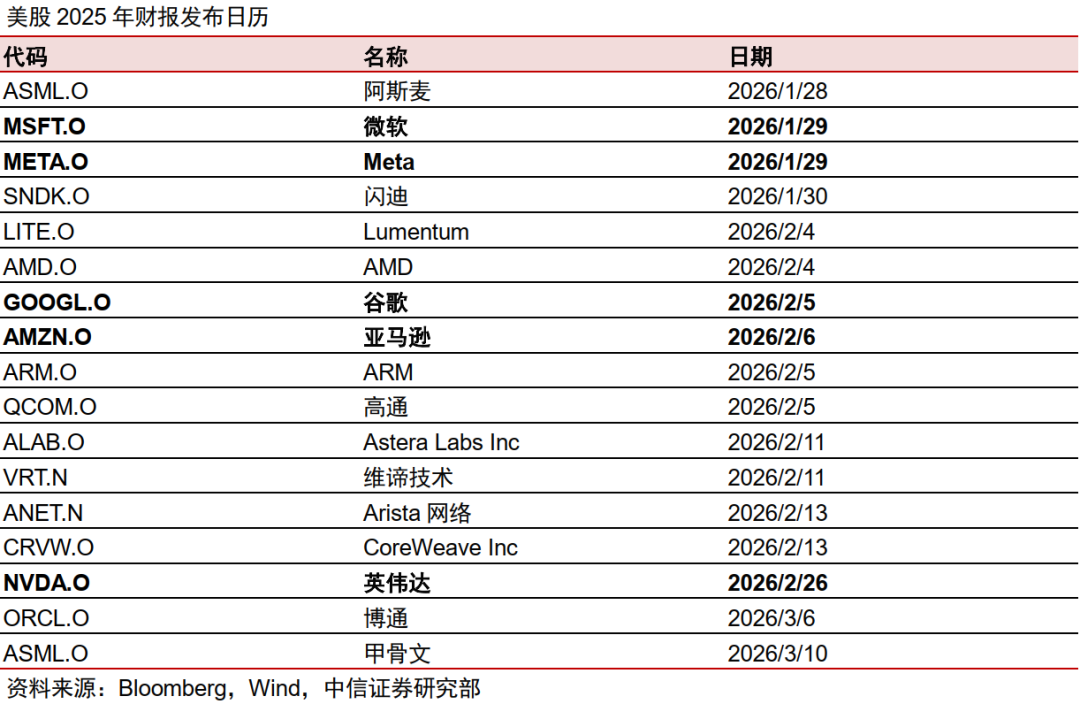 当前市场担忧美股CSP业绩情况以及Capex能否持续,四大CSP财报将成为重要观察窗口。2026年1月29日,微软和Meta财报发布,有望首次验证市场对算力需求和资本支出延续性的判断。随后,谷歌2月5日和亚马逊2月6日的财报发布,将进一步完善全年资本支出指引。2月26日英伟达财报发布和3月16-19日GTC大会亦有望开启市场对全年算力投资新一轮上升周期的判断,成为海外算力叙事转向乐观情形的重要催化点。