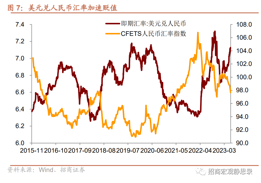 5月美元兑人民币汇率贬值速度明显加快,当月贬值幅度为2.6%,5月末跌破7.1%。本月人民币走弱主要是三方面因素所致:其一,国内国债收益率加速下行,而美债收益率因市场一度预期6月美联储将继续加息有所上行,中美利差倒挂幅度再度超过1个百分点;其二,国际外汇市场交易也因美联储加息预期的变化从空美元多欧元转为多美元空欧元,当月美元指数升值2.5%,美元兑人民币汇率贬值2.6%,二者较为接近,可见美元指数走强是美元兑人人民币汇率贬值的主要原因。不过,5月人民币汇率指数仅下跌1.1%,这说明人民币汇率贬值趋势可控,对其他货币大体仍处于升值状态。