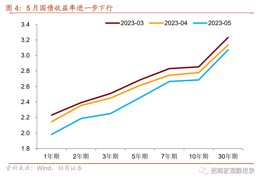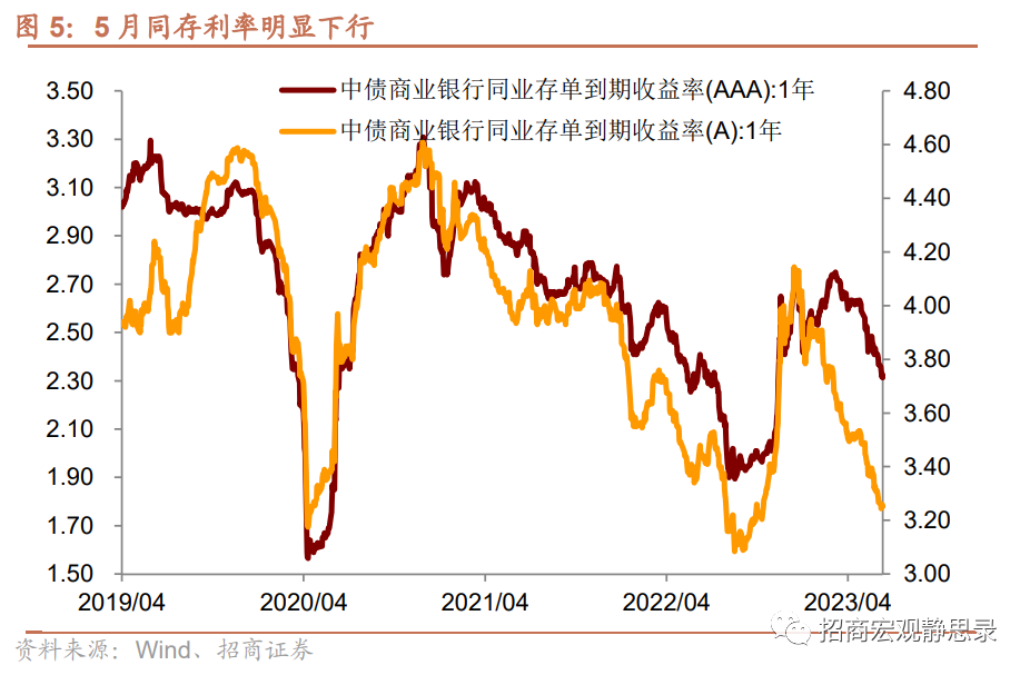 尽管央行货币政策执行报告已经透露出政策将转向中性的信号,但市场流动性环境仍在持续改善。5月DR007下行23bp,比4月走扩16bp,当月DR007平均水平为1.85%,比4月平均水平下行21bp,这也是春节以来DR007月平均水平首次低于7天逆回购利率。同业存单利率5月加速下跌。其中,AAA评级1年期同存利率下行19bp至2.395%,下行幅度比4月扩大18bp,A评级1年期同存利率下行20bp至3.285%,下行幅度同样比4月扩大18bp。