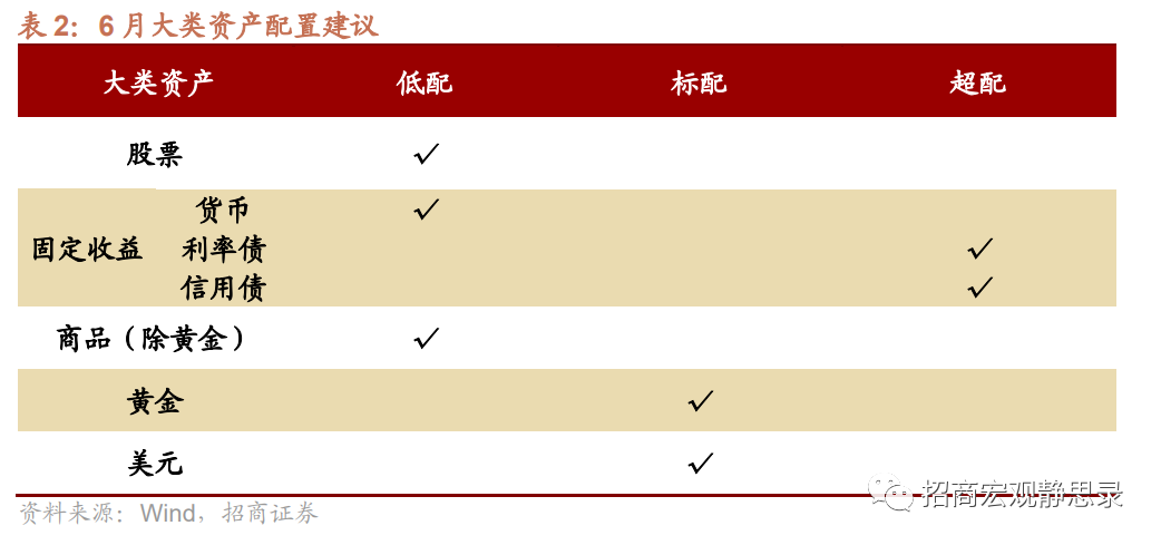 综上,我们建议6月低配风险资产,超配避险资产。但市场可能已接近变盘前夕,若投资期限扩展到中期,则应超配风险资产,低配避险资产。
