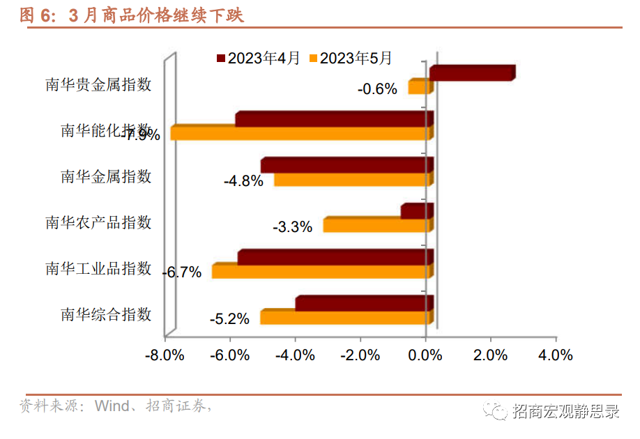 5月南华综合指数跌幅进一步扩大,当月下跌5.2%,比4月扩大1.1百分点。主要商品指数全面走弱。能化、农产品、工业品指数跌幅也同步扩大 ,金属指数跌幅有所收窄。尽管黄金价格持续上涨,但其他贵金属受基本面的拖累,导致贵金属指数也由涨转跌,5月下跌0.6%。投资-制造业链条的弱势是2季度以来商品价格重新定价的核心因素。