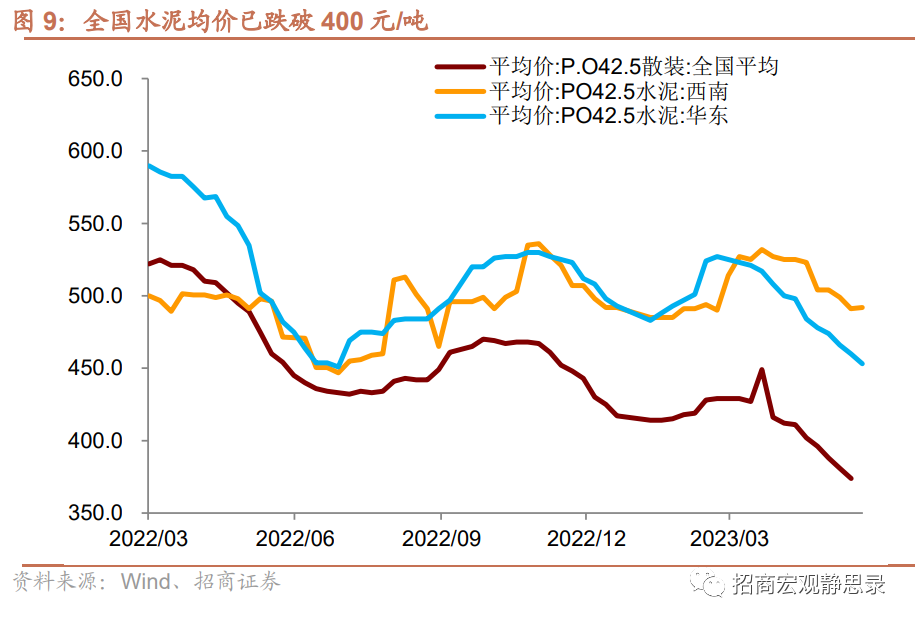 5月以来的价格高频指标也显示了投资需求的疲弱。5月以来全国水泥均价累计下跌6%,目前已跌至400元/吨以下。上一次全国水泥均价不足400元/吨还发生在2017年。华东、西南等我国主要基建地区的水泥价格也已经跌破500元/吨,尤其是华东地区水泥价格今年以来持续同比负增长。