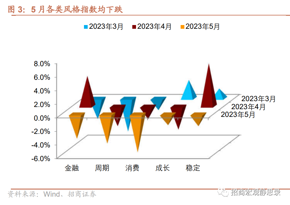 从市场风格来看,此前持续增长的稳定风格在5月也下跌1.8%。4月涨幅居前的金融风格也出现大幅调整,5月下跌3.7%,跌幅为今年以来最高水平。消费和周期风格连续3月下跌,尤其是消费风格跌幅明显扩大,显示市场对消费未来的悲观预期。成长风格5月仅下跌1.7%,跌幅最小,但也连续两月下跌。AI热潮后,市场可能将更加理性地对相关行业重新定价,毕竟人工智能目前还难以全面反映在企业业绩上。