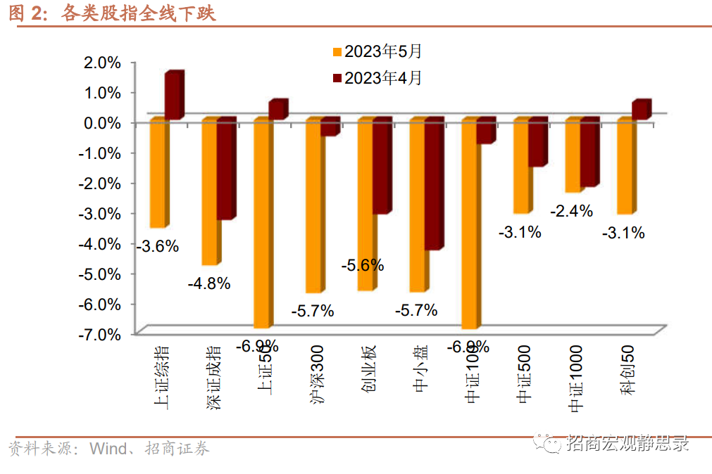 5月各类股指全线下跌,大盘股领跌,中小市值股票跌幅相对较小。其中,上证50和中证100跌幅均为6.9%,中1000下跌2.4%,跌幅最小,其次为中证500和科创50,跌幅均为3.1%。5月A股泥沙俱下,此前均有不错表现的投资主题也出现明显调整。