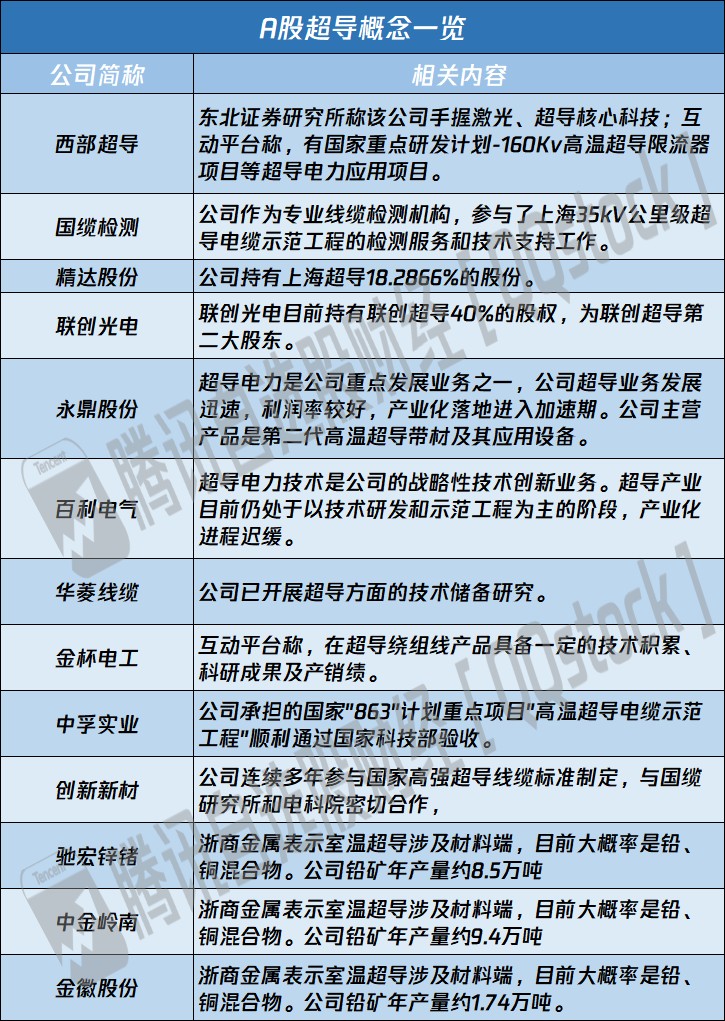 自选哥根据多家公司的回应,整理了一份超导相关业务的概念股名单,供投资者参考: