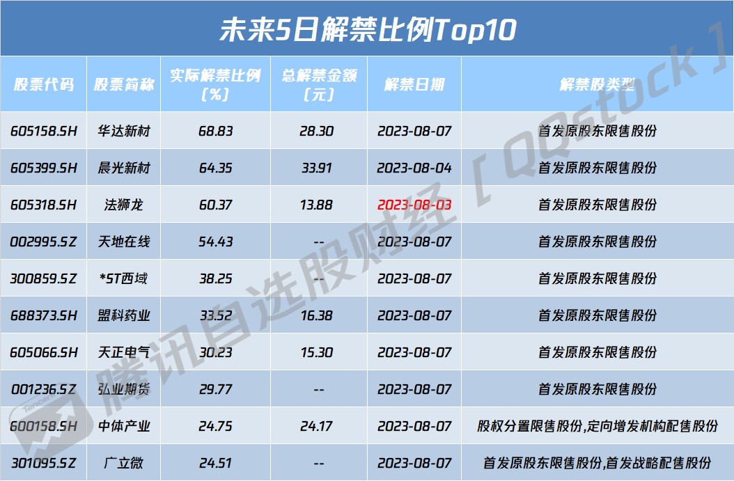 从解禁比例来看,未来5日华达新材解禁比例达68.83%,其次解禁比例居前的分别为晨光新材、法狮龙;从解禁市值来看,江波龙、广立微、弘业期货等股解禁市值居前。