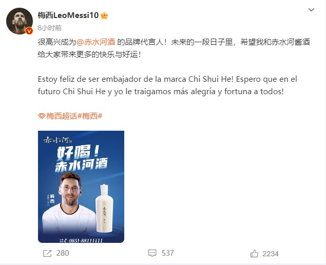 8月1日中午,账号认证为“阿根廷足球巨星梅西”的微博宣布,梅西成为赤水河酒的品牌代言人。目前,网络上关于这一品牌的介绍极少,进一步深挖下来发现,赤水河酒背后竟跟A股公司史丹利相关。