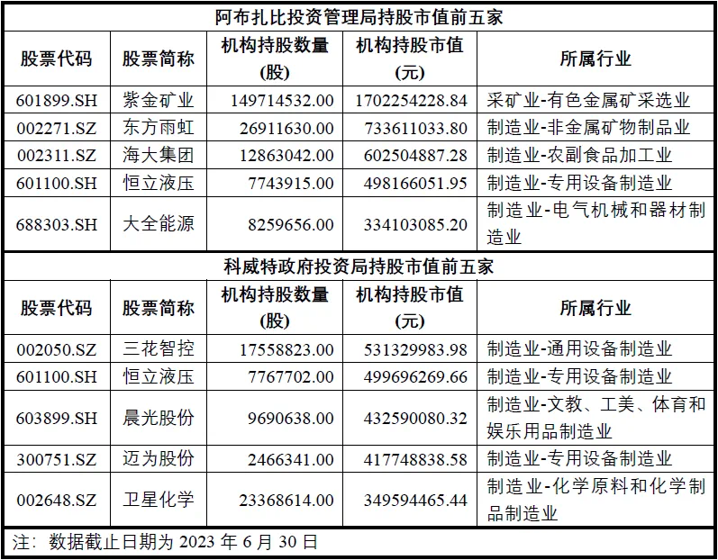 阿布扎比投资局持股市值最大的前五家公司分别是:紫金矿业、东方雨虹、海大集团、恒立液压、大全能源。科威特投资局持股市值最大的前五家公司则为:三花智控、恒立液压、晨光股份、迈为股份、卫星化学。