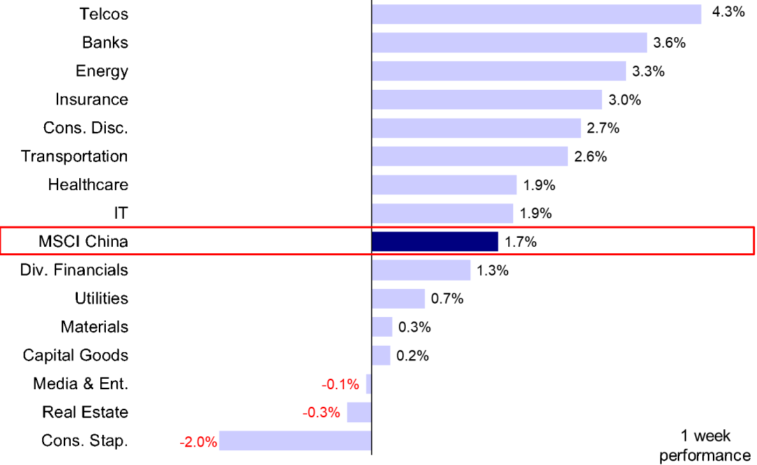 随着海外市场在套息交易企稳和“衰退担忧”缓解下大幅反弹,港股市场主要指数本周同样收涨。其中,恒生国企上涨2.4%,恒生指数、MSCI中国与恒生科技分别上涨2.0%、1.7%与0.7%。板块上,电信服务(+4.3%)、银行(+3.6%)与能源(+3.3%)涨幅居前,而必需消费(-2.0%)、房地产(-0.3%)与媒体娱乐(-0.1%)板块落后。