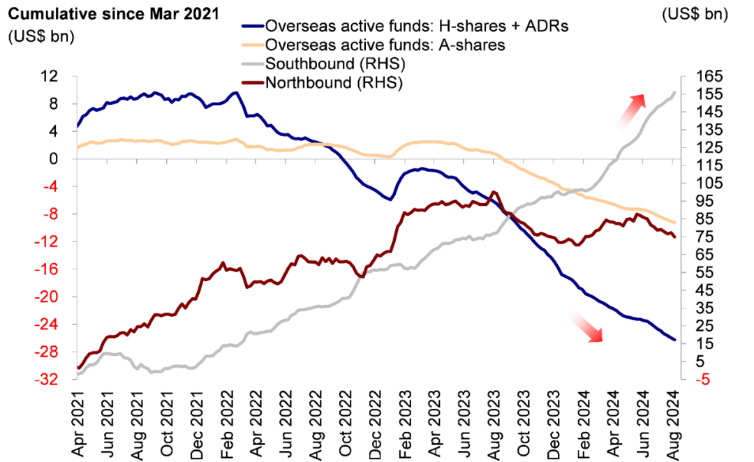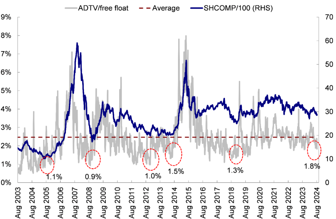 基本面偏弱环境下,政策加码仍有必要。部分政策当前已经“对症”,但力度和速度仍需加强。财政方面,5月以来政府债发行提速,不过7月财政支出边际小幅走弱。货币方面,当前美联储降息预期和人民币升值为国内政策打开了更多空间。如果政策可以借此机会持续发力,将为后续资金流入和市场反弹提供更多支撑。但“对症”政策大幅发力之前,投资者信心仍待修复,市场情绪低迷,体现为市场缩量交易。本周港股市场主板日均成交额降至797亿港币,较上周的1,036亿港币收窄,也低于2010年以来935亿港币的历史均值。A股市场上周缩量交易更为明显,8月13日成交额创近5年新低,连续两日全市场交易额低于5,000亿元,当前以自由流通市值计算换手率降至1.8%,若剔除量化资金可能接近以往市场底部水平1.5%以下。但我们认为,市场缩量交易后表现并不确定,可能触底反弹也可能震荡磨底,关键在于政策和基本面是否出现积极变化,可以带动投资者信心修复。