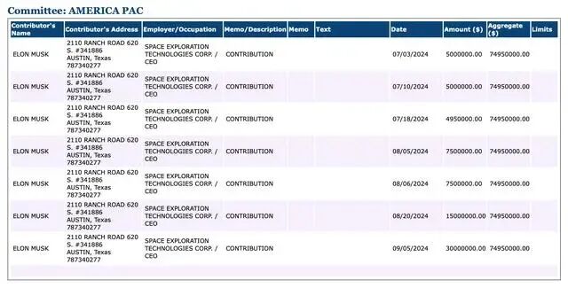 文件还显示,马斯克是“美国政治行动委员会”的唯一捐助者。该组织的使命是帮助特朗普竞选,特别是在需要争夺的宾夕法尼亚州。该组织还在全国各地的其他共和党国会候选人身上花钱。