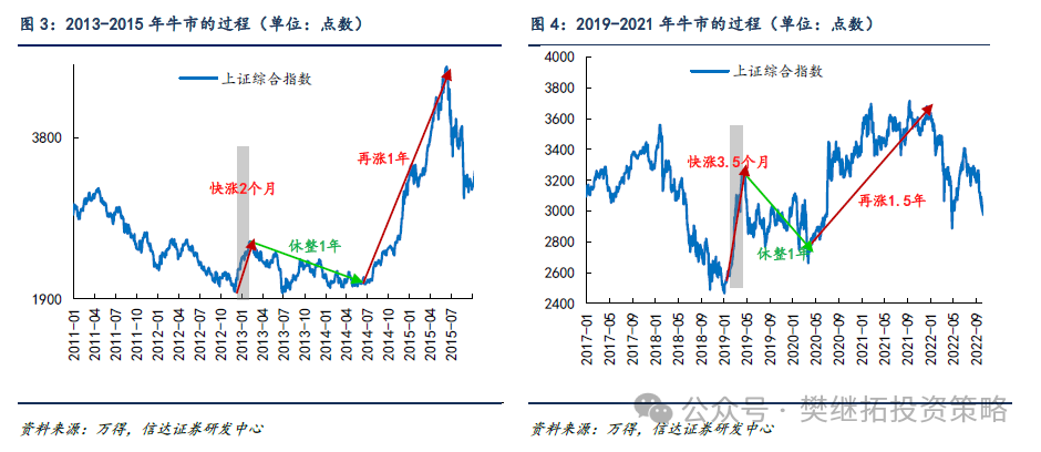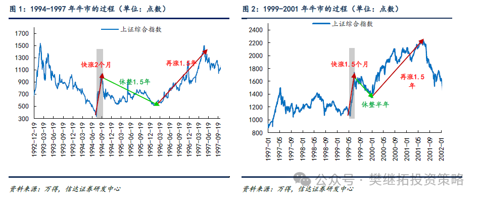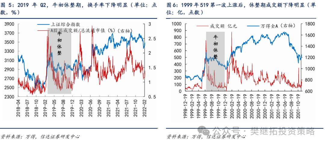 (1)调整的性质:牛初的震荡休整,会让牛市信仰暂时破灭。牛市初期一般快速涨一波修复熊市或之前1年大部分跌幅后,会进入休整回撤(时间长达半年-1年)。1994年8-9月牛市初期,市场快涨2个月,随后震荡休整1年半,1996-1997年进入牛市中后期,市场持续稳定上涨1年半。1999年5月19日-7月初,牛市初期,市场快涨1个半月,随后震荡半年,直到2000年初才进入新的上涨趋势,2000-2001年中的牛市中后期,市场持续稳定上涨了1年半。2012年12月-2013年1月,熊市刚结束的2个月,市场快速上涨,但随后的2023年Q2-2014年Q1,市场震荡了1年,直到2014年Q2-2015年Q2,市场才有持续上涨的牛市。2019年Q1,牛市初期,市场快涨1个季度,随后震荡1年,直到2020年Q2才进入新的上涨趋势(牛市中后期)。(2)牛初休整期,换手率和交易额可能会萎缩到“接近熊市”的水平。最近另一个投资者关注的市场信号是交易量的持续下降,这其实也是牛市初期休整期大概率会出现的现象。比如2019年Q1过后,换手率(A股成交额/流通市值)由2.58%跌到0.7%,跌到了2018年熊市末期Q4的平均水平(不是最低水平),但指数并没有全跌回前低水平。1999年519第一波上涨后,全A成交额从751亿跌到了44亿,也回到了1999年初熊市的水平,但指数并没有跌回前低水平。