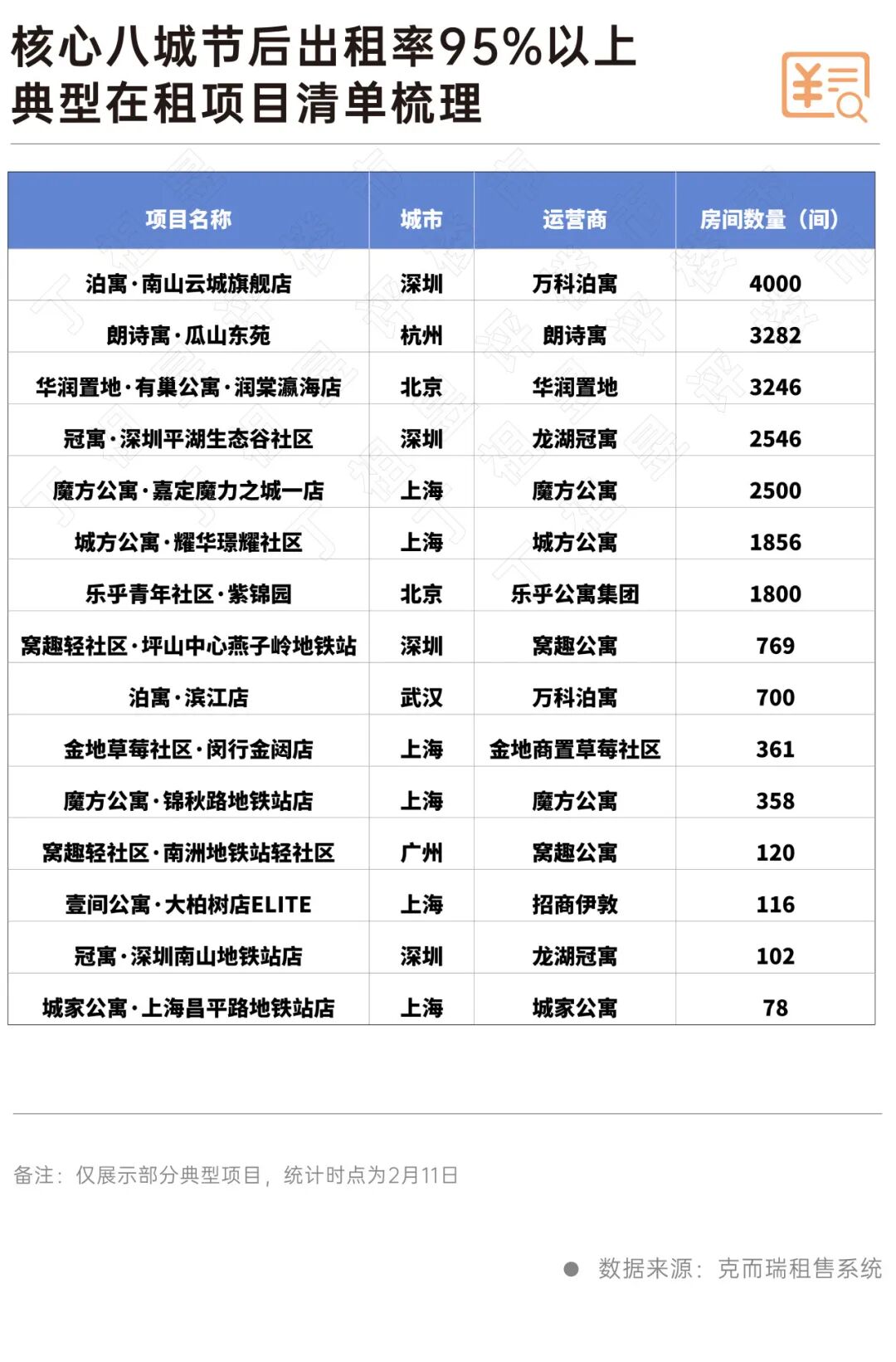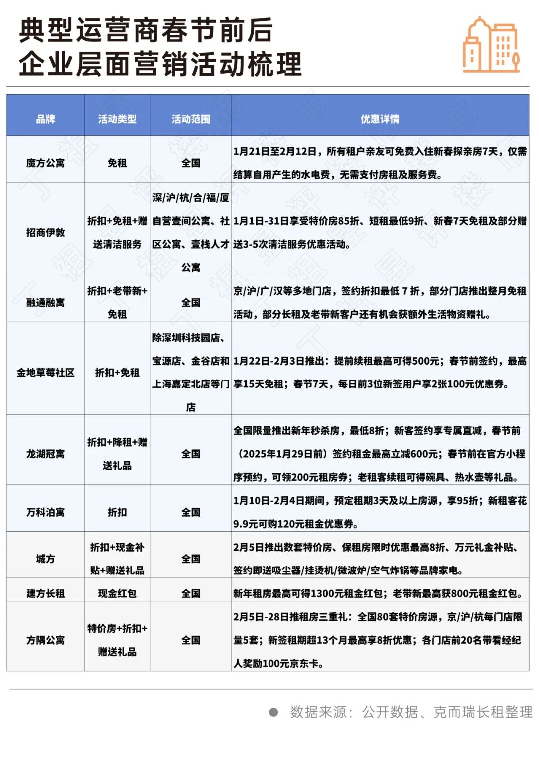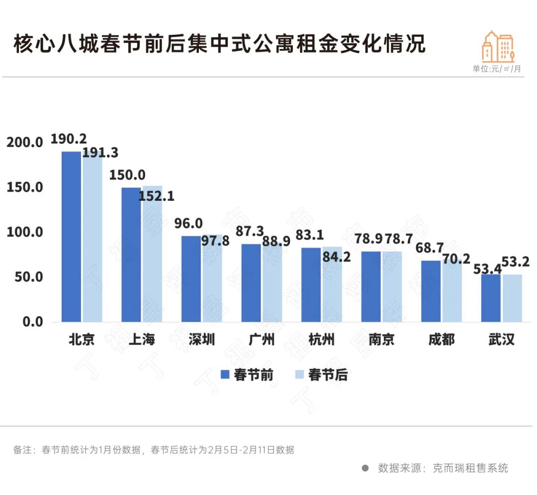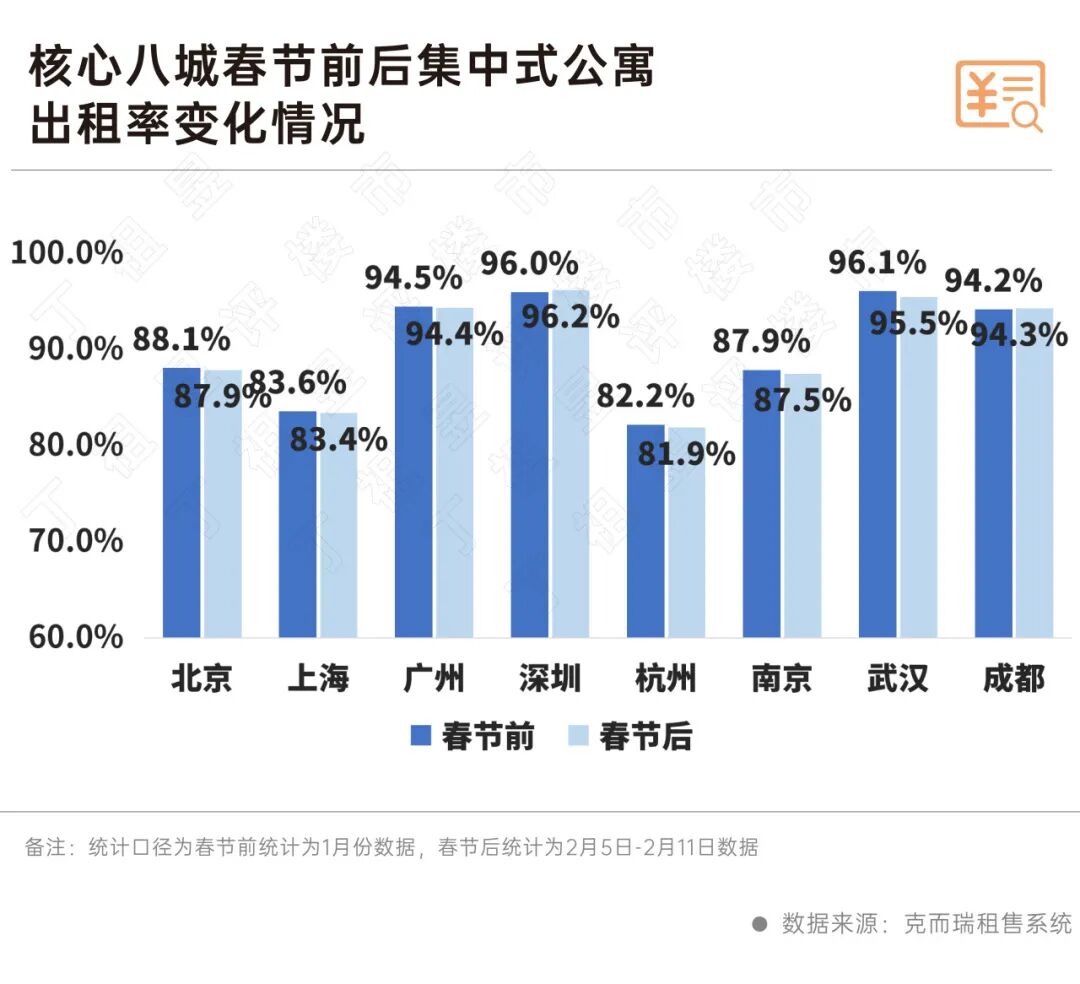 春节前后的住房租赁市场往往也会随之发生显著变化,节后大量务工人员返城、职场新人涌入就业市场,换租需求也集中释放 ,租赁市场普遍会迎来供需两旺的局面。 同时,随着近年政策的不断调整和保租房的加速入市,也深刻影响着市场格局,而这些因素交织在一起,使得春节后的住房租赁市场充满了变数与机遇。 那么,今年春节后住房租赁市场具体有哪些变化?租金走势如何?供需结构又有怎样的调整呢? 01 节后开工首周整体租金微涨1.1%出租率维稳 根据CRIC城市租售系统的最新监测数据显示,春节后首周,核心八城集中式公寓平均租金坪效达到102.1元/㎡/月,较节前上涨约1.1%。这一变化主要归因于“返城季”期间大量人口回流至核心城市,导致住房租赁市场需求阶段回暖,这一现象与节后市场对于租金变化的预期也基本相符。 从各单个城市的具体表现来看,在核心八城中,仅有南京和武汉两城的住房租赁市场反应相对滞后,租金水平未出现上涨态势,其余六个城市的集中式公寓租金均有不同程度的上浮,其中,成都的租金涨幅最为显著,约为 2.2%;深圳、广州、上海等一线城市的租金涨幅紧随其后,广深更是紧逼2.0%,上海约1.4%。 而导致节后城市租金波动的核心原因在于人口的流动,尤其是人口流动频繁的城市,租赁市场呈现出波动幅度相对更大的特征。依据春节后全国人口迁徙指数,2月2日-5日为返程高峰,其中2月3日达到峰值,以该日为例,热门迁入地排名前10的城市中,前5位均来自核心8城。成都以2.80% 的迁入比例位居首位,其后依次为广州、北京、深圳和上海,这种明显的人口回流现象无疑极大地刺激了租赁市场的需求,进而推动租金在短期内显著回升,预计这一态势将延续至3月份。 在出租率层面,鉴于租赁成交具有一定的周期性,节后复工首周的出租率数据尚未呈现出明显波动。 然而,值得肯定的是当前租客的关注热情极为高涨,据某知名长租公寓品牌负责人的反馈,一线城市旗下多家门店的到访量显著提升,不过实际成交数据的体现可能存在延迟。具体到数据上,核心八城监测项目春节后的平均出租率约为90.1%,较节前微降0.2个百分点,这一数据充分彰显出整体出租率趋于稳定的态势。 02 单项目运营表现分化 优惠活动助力出租热度常态延续 聚焦单项目运营表现,在核心八城重点监测的1000个在租项目中,挂牌租金跟节前相比出现上涨趋势的占比约50%,与节前基本一致的占比20%,剩下30%小浮下调。而出租率方面超过六成项目在节后仍高达95%以上,仅有17.5% 的项目出租率低于90%。 从项目自身特性剖析,出租率较高的项目通常具备具备区位优势显著、产品品质过硬、价格定位精准、知名品牌商赋能、整体形象良好的特征。 如万科泊寓位于深圳的南山云城旗舰店,周边配套设施完善,生活出行便利度高,户型大小及格局分布科学合理,即使小户型也设置了足够多的收纳空间,同时公区配置丰富多元,不仅涵盖图书馆、瑜伽房、电影厅、健身房、公共厨房等,同时注重社区绿化打造,还设有专门用于举办市集活动的公共场地,对目标客群具有极高的适配度。 除此之外,为应对春节传统淡季出租率的波动,该门店于节前便提前策划变相降租优惠活动,自2025年1月1日至1月31日,提前看房并缴纳定金的租客,年后转签约可享受定金膨胀优惠,如房源租金低于1000元,500元定金可膨胀至1000元抵扣租金;房源租金大于等于1000元,800元定金可膨胀至1600 元抵扣租金,活动成效显著,有效稳定了出租率。 除泊寓・南山云城旗舰店外,壹间公寓、城方公寓等项目也纷纷采取优惠策略,提前应对传统淡季的市场冲击。 如壹间公寓・大柏树店ELITE推出新春秒杀价活动,35㎡单间月租金在4048-4692元,签1年及以上合同可享92折优惠。城方公寓・耀华璟耀社区推出新春钜惠,48㎡一室一厅一卫、70㎡二室两厅一卫和100㎡三房两厅两卫等指定户型限时8折起,且城方粉丝签约赠送内衣洗衣机、加湿器、微波炉、恒温电水壶等品牌家电。窝趣・南洲地铁站轻社区自2025年1月16日起,签约6个月租房合同免15天房租,签约13个月以上免30天房租,通过活动报名完成签约可领100元购物卡补贴,成功邀请好友入住还能获租房金及200元京东卡奖励。魔方公寓・锦秋路地铁站店推出暖春租房和新春探亲房活动,前者在2025年2月28日前,签约≥6个月,实际租期内全部法定节假日租金全免(合同超12月,前12个月节假日租金免除);后者在2025年1月21日—2月12日,所有在住住户可免费入住新春探亲房7天。这些活动丰富多样,通过租金折扣、免租期、赠送礼品等方式,有效提升了市场竞争力与项目出租率。 03 市场以点促面、企业自上而下共同推进租赁行业平稳健康发展 事实上,除项目层面开展的 “留客引客” 活动外,春节前夕,众多运营商从企业战略层面实施全国范围内的积极布局,推出一系列涵盖免租、降租(折扣)、现金补贴以及礼品赠送等形式的优惠举措。其目的在于抢先在春节前实现准客户预定,以便节后能够快速完成转签,进而平稳度过传统春节租赁淡季,最大程度缩短房源空置周期。 具体而言,招商伊敦在深圳、上海、杭州、合肥、厦门等地自营的壹间公寓、社区公寓以及壹栈人才公寓,推出新春7天免租和特价长租房85折的优惠活动。金地草莓社区除深圳科技园店、深圳宝源店、深圳金谷店、上海嘉定北店等门店外,实施提前续租最高可得50