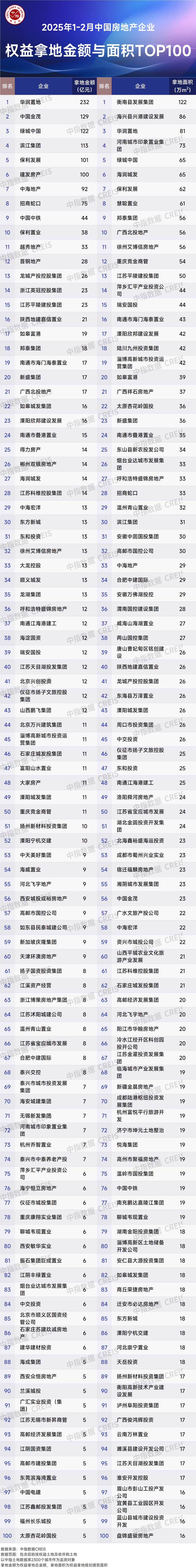 智通财经APP获悉,2025年1-2月,TOP100企业拿地总额1998.6亿元,同比增长26.7%。土地市场点状回暖、“开门红”行情延续,TOP100企业拿地总额同比两位数增长。自2024年9月底以来,一线及强二线城市二手房成交量价已呈现筑底回升态势,市场情绪逐步回暖,房企对后市的信心有所修复。2025年年初,地方政府积极推出位于核心区域、配套成熟的优质地块,进一步增强了房企拿地积极性。同时,房企也有一定补库存的意愿,年初拿地能够在当年实现开工并进入销售阶段,有助于房企快速回笼资金,提升周转效率。
