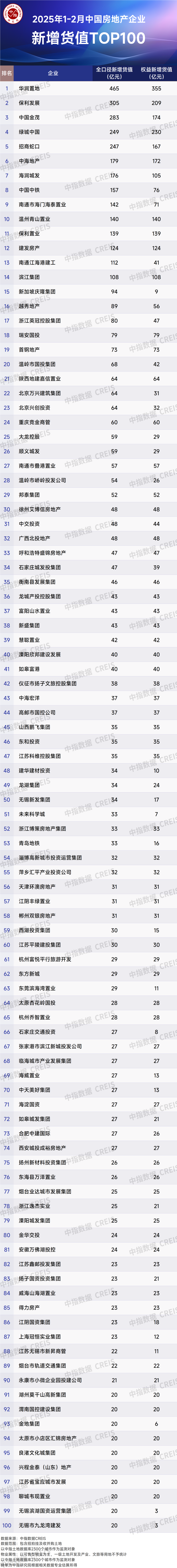从新增货值来看,华润置地(01109)、保利发展(600048.SH)和中国金茂(00817)位列前三。2025年1-2月,华润置地以465亿元新增货值占据榜单第一,保利发展以305亿元新增货值位列第二,中国金茂新增货值规模为283亿元,位列第三。TOP10企业2025年1-2月新增货值总额2342.8亿元,占TOP100企业的39.2%,新增货值门槛为20亿元。