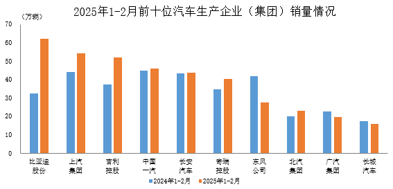 智通财经APP获悉,据中国汽车工业协会统计分析,2025年1-2月,汽车销量排名前十位的企业(集团)共销售385.6万辆,占汽车销售总量的84.7%。在上述十家企业中,与上年同期相比,东风公司、广汽集团(02238)和长城汽车(02333)销量呈不同程度下降,其他企业销量均呈不同程度增长,其中比亚迪股份(01211)增速最为显著。