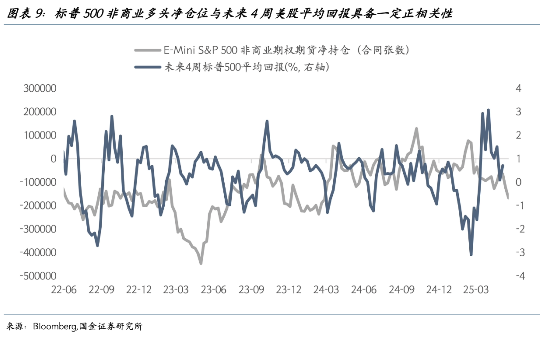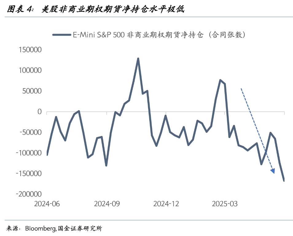而美股机构资金普遍偏悲观。从CFTC报告的E-mini标普500非商业期权期货净持仓数据来看,非商业交易者通常并非套期保值者(即不利用期货市场来对冲现有业务敞口),而是以对冲基金为代表的投机性机构资金。截至6月10日,美股非商业期权期货净持仓-12.4万张,位于近一年4%的极低分位数水平。