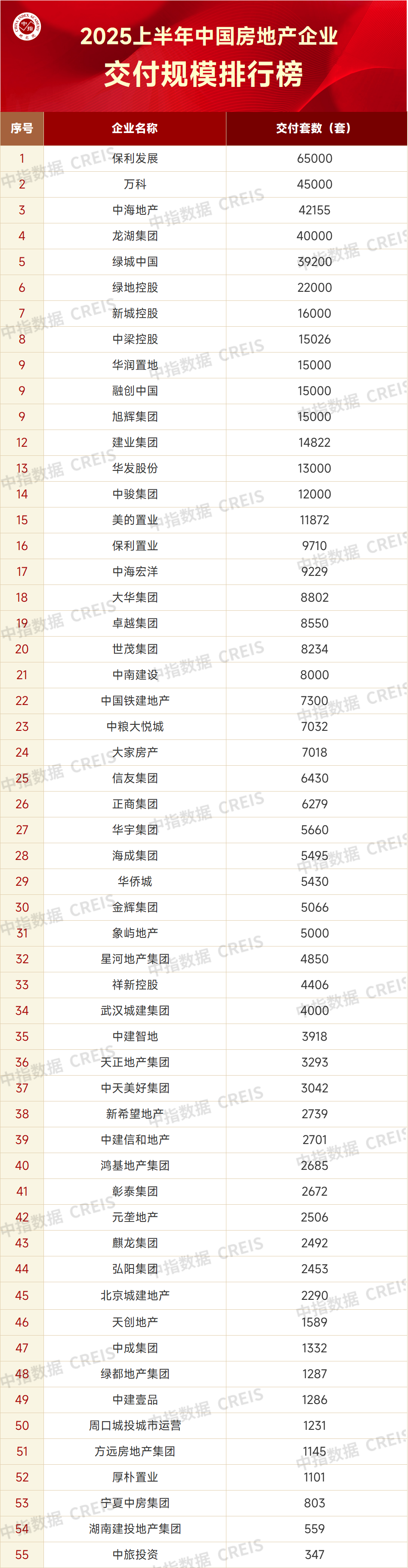 智通财经APP获悉,7月21日,中指研究院公布2025上半年中国房地产企业交付规模排行榜。2025年上半年,“好城市+好房子”支撑新房市场整体保持平稳,一季度市场延续修复态势,但二季度边际有所转弱。预计下半年各级政府将全力推动已出台政策落地见效。当前居民收入、房价预期以及市场优质供给仍偏弱,同时重点城市中二手房对新房“替代效应”仍明显,预计下半年新房市场仍将波动调整。市场分化延续,“好城市+好房子”仍具备结构性机会。