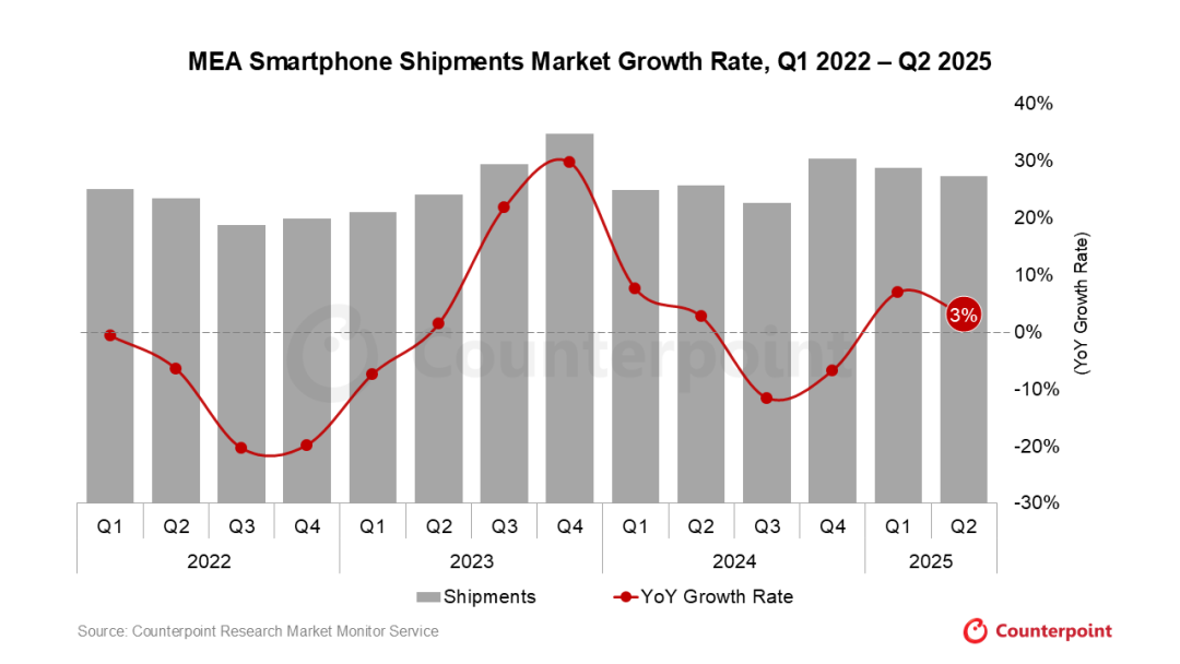 智通财经APP获悉,根据Counterpoint市场监测服务的最新研究,2025年Q2,中东非地区智能手机出货量同比增长3%,为该地区连续第二个季度增长。增幅受到宰牲节(Eid al-Adha)期间的销售与促销、区域经济好转以及更强的本币支撑下的消费力提升所推动。这些因素释放了被抑制的需求,OEM与分销商随之提升供货量,许多品牌也在节庆季前清理旧库存。
