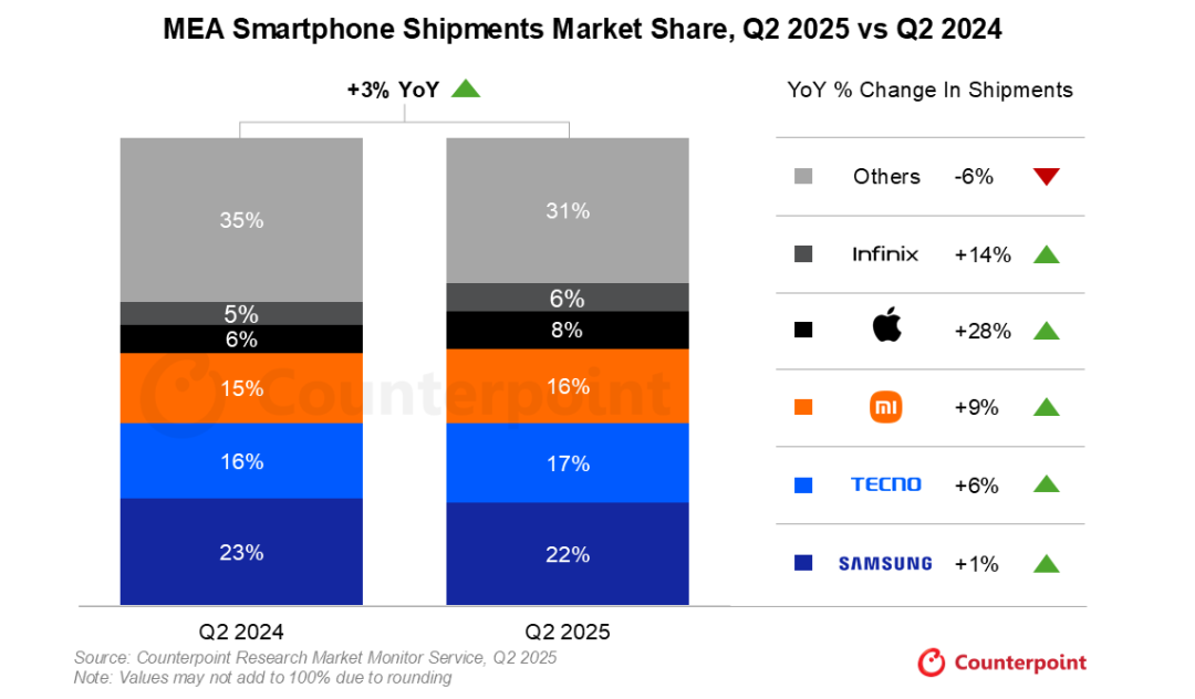 三星(Samsung)在2025年Q2 以1%的同比增长位居中东非地区市场第一,尽管其在售机型数从105大幅压缩至73。其增长由A系列在更广零售覆盖与竞争力中端产品的带动。三星还受益于灵活分期、节庆促销、以旧换新以及与运营商和本地零售商的合作关系;在AI主题广告上的高投入强化了其领导地位,本地化制造亦帮助降低成本。
