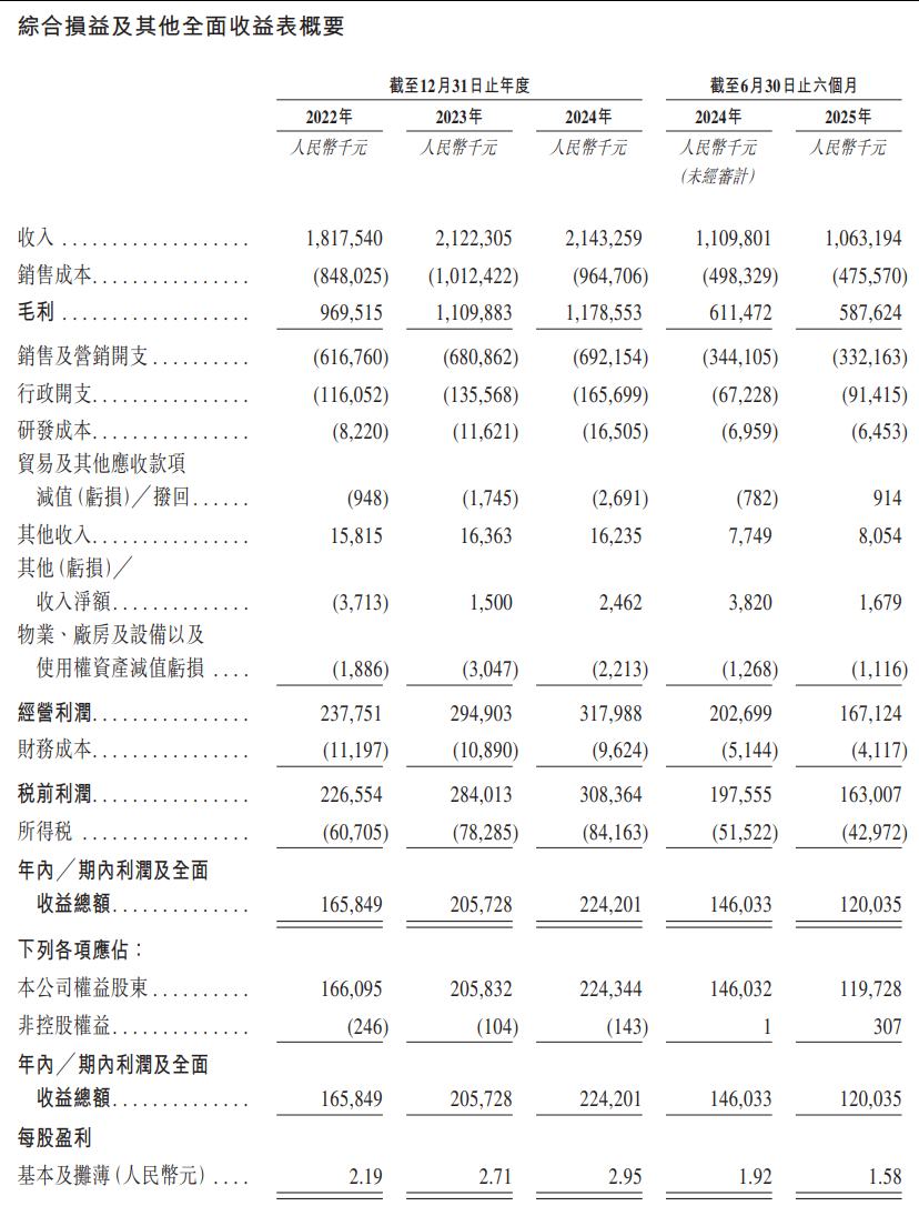 财务方面,于2022年度、2023年度、2024年及2025年截至6月30日止六个月,公司实现收入分别约为18.18亿元、21.22亿元、21.43亿元、10.63亿元人民币;同期,年/期内利润及全面收益总额分别约为1.66亿元、2.06亿元、2.24亿元、1.20亿元人民币。