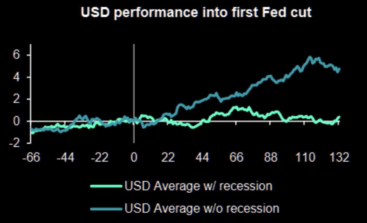 更广泛的担忧是,黄金和矿业股现在表现得像动量股。美元逆转可能迅速削弱看涨热情,而鉴于美元目前交易在公允价值附近,这种风险正在上升。历史上美元在美联储降息周期后通常会上涨。