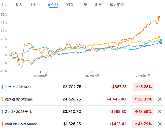 当FOMO(错失恐惧症)情绪席卷市场时,投机热潮已不再局限于科技股等风险资产,而是向黄金、黄金ETF等传统避险资产蔓延。标普500、纳指、黄金和黄金矿业股同步暴涨,这种异常的资产相关性正释放危险信号。